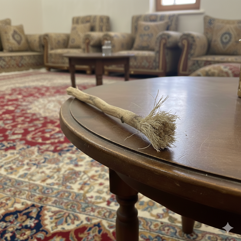 وفي الاجتماع العائلي يوم الجمعة، تختلط ريحة البخور والقهوة برائحة مساويكها التي توزعها على الجميع. تجلس هي على الكرسي المفرد وتفصلها عن الكنبة بجانبها طاولة دائرية خشبية. تتبادل الأحاديث مع أخيها الأصغر، يعلق مسواكه الذي يستخدمه مجاملة لها في تقويمه العلوي، يسحبه بشدة من بين فتحات تقويمه، ويعيد استخدامه مجددًا، رأس مسواكه أشعث، أشبه بمكنسة خشبية عفى عليها الزمن. وفي ذات الوقت، نهض أخوها مجيبًا والدتهم، وهي نهضت ذاهبة للمطبخ. سبقته عائدة للمجلس، أخذت مسواكها الذي وضعته على الطاولة، وبدأت باستخدامه. جاء أخوها مبتسمًا لها وجلس مكانه، قال: