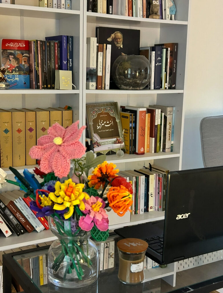نجلس بمحاذاة بعضنا البعض، على كنبة رمادية اللون، نتابع مشهدًا لامرأة تزرع في بيت زجاجي مجاور لمنزلها، أقول:” إذا صار عندنا بيت ان شاء الله لازم نحط لي زيها بيت زجاجي، عشان ازرع فيه على كيفي واذا سافرنا ما تموت لأن فيه نظام سقي.” يقول زوجي:” شوفي كيف أنتِ غير عني، اي شيء جديد تشوفينه